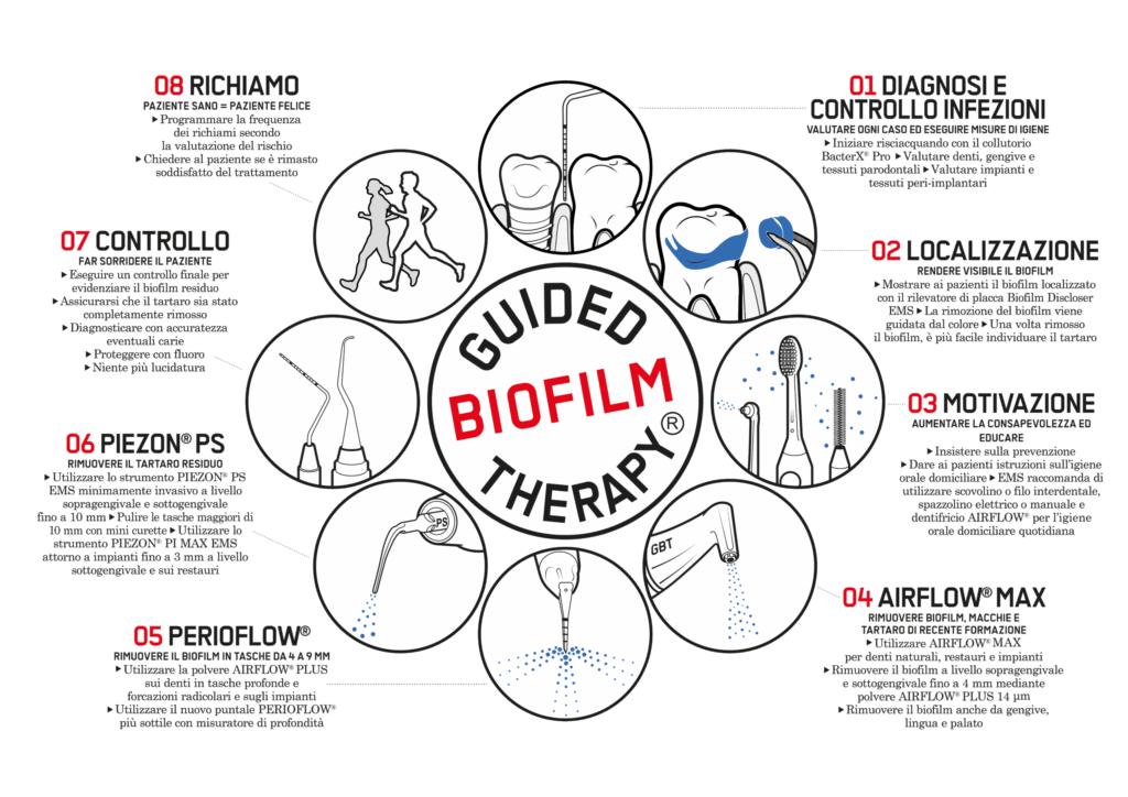 La Guided Biofilm Therapy consiste in protocolli di trattamento che si basano sulla diagnosi del singolo paziente e sulla valutazione dei rischi in maniera tale da raggiungere risultati ottimali. Il trattamento viene eseguito nel modo meno invasivo, con il massimo livello di comfort, sicurezza ed efficienza.