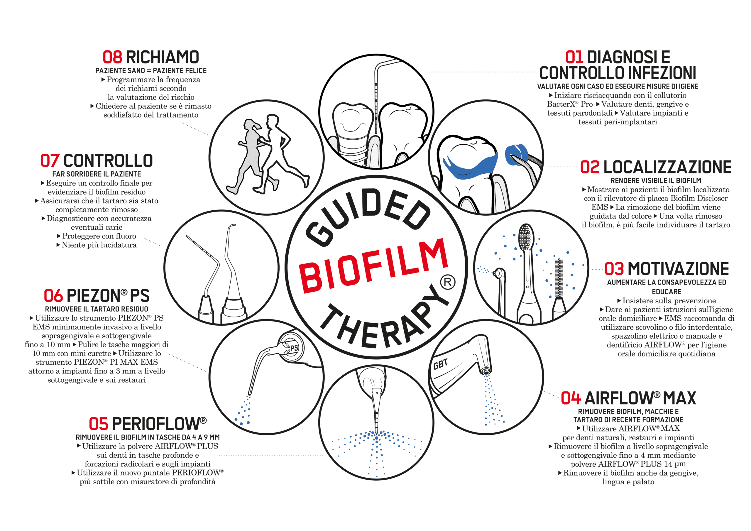 GBT produce risultati migliori ed è più piacevole perché il biofilm e il tartaro vengono completamente rimossi sopra e sotto gengiva da denti, tessuti molli e impianti. GBT cambia radicalmente la meccanica professionale convenzionale rimozione della placca e apre un nuovo concetto di terapia di prevenzione nella pratica per la soddisfazione del paziente.”